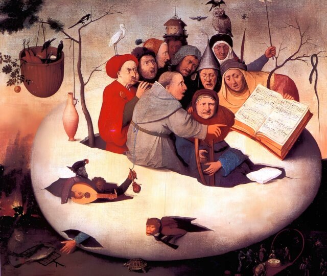 «Концерт в яйце», хотя и менее известен, в меньшей степени демонстрирует многие из тех же черт, за исключением, пожалуй, религиозной философии, которую многие видели в триптихе. Здесь группа музыкантов образует желток яйца, что, видимо, символизирует их глупость. Монах, стоящий к нам спиной, пытается руководить группой, указывая на партитуру, но остальные, кажется, не заинтересованы в том, чтобы следовать за ним. Он настолько увлечен своим бессмысленным занятием - то ли из-за преданности, то ли из-за самолюбования, - что не замечает, как его кошелек крадет маленький человек, стоящий с ослиноголовым лютнистом. Большая часть причудливых образов в этом произведении, вероятно, связана с популярными голландскими выражениями XVI века, значение которых, как и оригинальной картины Босха, было утеряно со временем. Воплощение популярных выражений и пословиц в картинах было излюбленной практикой нидерландского искусства того времени (например, Питер Брейгель Старший посвятил этому целую картину), которую Босх использовал и в других работах.