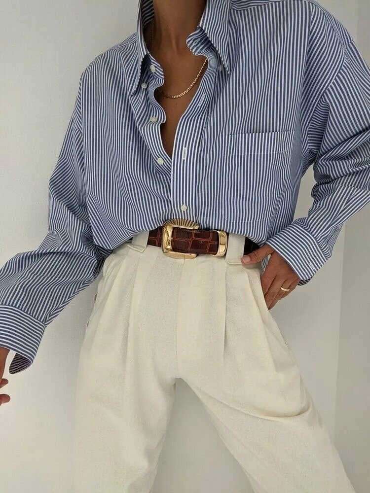 Полоска не должна быть мелкой, чем шире - тем лучше. Рубашка должна выглядеть статусно, дорого, из качественной плотной ткани (конечно же 100% хлопок), хорошо держать форму, а не струиться, как вискоза или шёлк. Я люблю блузки и из таких тканей, но тут другая идея - воплотить образ в стиле Old Money, который ассоциируется у меня с отдыхом аристократии на каком-нибудь европейском курорте вроде Лазурного берега или Портофино. Море, яхты, набережная в цветах с уютными ресторанчиками - идеальное место для образа в морском стиле - полосатая рубашка в дуэте с белыми брюками в сопровождении аксессуаров в виде кожаного ремня, солнцезащитных очков и стильной сумочки.