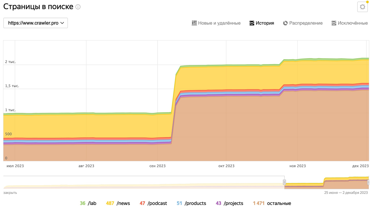 Давно руки чесались: раскрыть теги к индексации. А что? Там около 1 тыс тегов, а значит страниц, которые легко удвоят твой индекс. Правда до конца не было понятно, к каким последствиям это привидёт. По-сути, вариантов было 3: Скажем так, негативный вариант был самым маловероятным. Поэтому решил рискнуть: вдруг будут какие-то подвижки. Просто открыл раздел с тегами в роботсе. И Яндекс постепенно стал пожирать страницы тегов. Гугл же словно никаких изменений не заметил. Кроме того, параллельно прикупались ссылки на разные страницы, но не на теги. И вот с каждой закупкой, всё больше тегов входило в индекс. Видно, что сначала теги рывком вошли в индекс 9 сентября. А потом дожирались роботом. Кроме того, одновременно с этим, я натолкал в подвал дополнительных ссылок. Страницы тегов Результаты Выводы Эксперимент 2.0 *** Страницы тегов слишком однообразные https://www.crawler.pro/news/2023/2000-stranits.html *** Блямба В5 - Продюсер = организатор в кубике - Стратегия подходит для новых сай