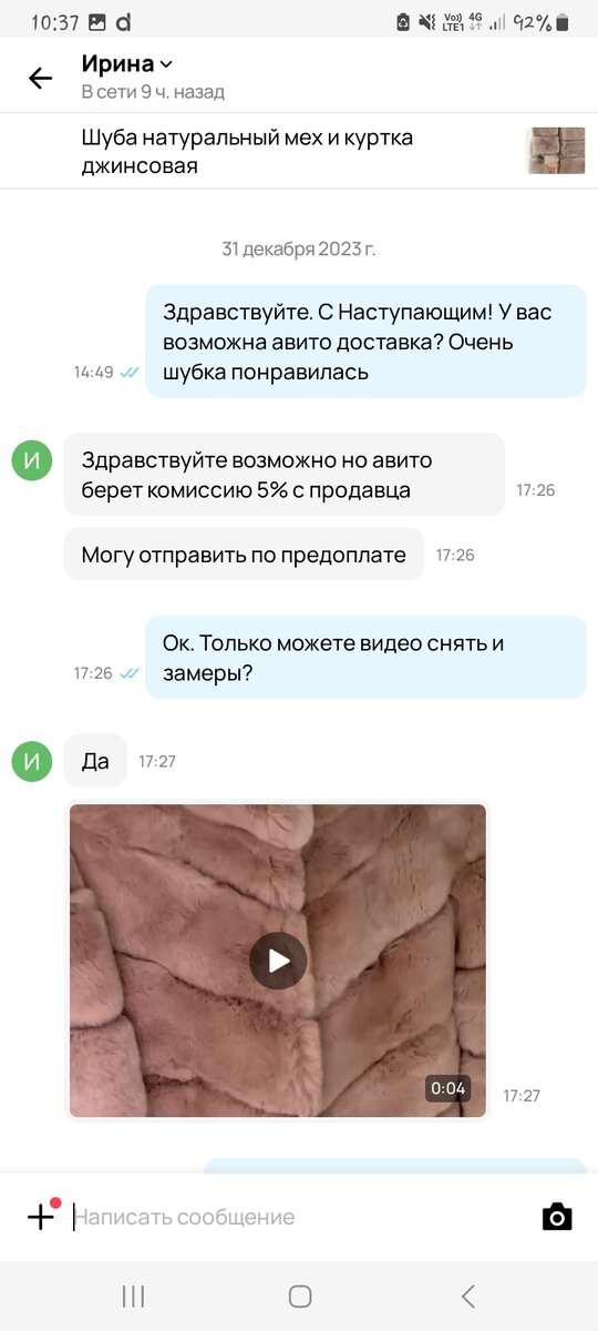 Честное слово, не хотела писать эту статью. Но последний случай меня выбесил просто. Я покупаю на авито вещи не только для себя, но что то и для перепродажи. И не первый раз. И уже столкнулась с тем, что в большинстве своем люди обманывают. Потому что как в известной среди молодежи песне "но за деньги да". Вот и здесь ради денег люди готовы на все. И я просто иногда рот открываю от наглости. Честное слово, никогда с таким не сталкивалась раньше. Но авито может все. Одежда "в идеальном состоянии" с дырками и катышками, сломанные молнии и оторванные застежки и прочая мелочь. Последние пару месяцев я активно покупаю на авито. И вот ощущение, что нормальных продавцов нет. Обязательно кто то что-то умолчит или недоговорит. А сейчас - бинго, вершина этого айсберга. Во-первых продавец с большим количеством положительных отзывов и нормальный в общении (не верьте! гарантии никакой!). Например вот. Написала продавцу. В общении человек достаточно вежливый и приятный. Шубка понравилась. Пишу даль