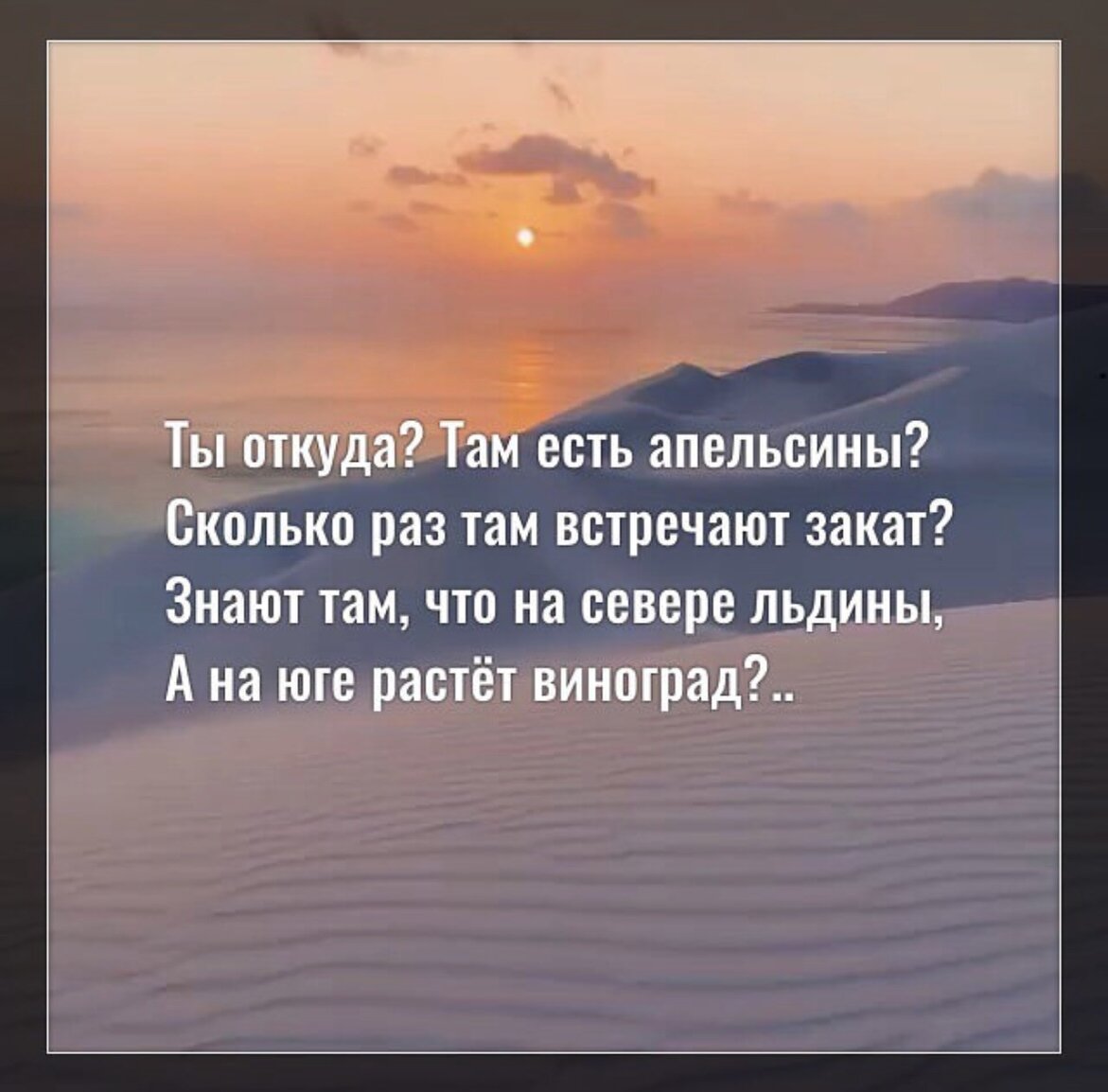 Ты откуда? Там есть апельсины? Сколько раз там встречают закат? Знают там, что на севере льдины, А на юге растёт виноград? Что за место? Там кто-нибудь дышит, Когда в сердце от теплоты взрыв? Кто-то крики о помощи слышит, Лечит чей-то душевный нарыв? Облака там наутро считают? Проверяют ли солнечный пульс? Как друг друга там кто понимает? И куда держат в целом свой курс? Передай им от нас подарок, Он не вместится правда в рюкзак, Он без ленточки и без рамок, Его дарят за просто так. Чтобы светом внутри согрело, Чтобы было в ночи светло, Чтобы чья-то Душа обомлела И ей стало бы в миг хорошо!