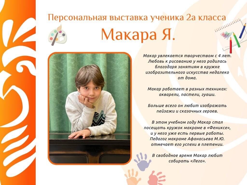 Макар увлекается творчеством с 4 лет, занимается в кружке изобразительного искусства.