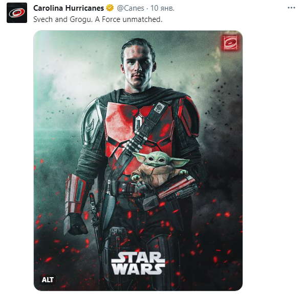 На днях официальный аккаунт «Каролины Харрикейнз» в X опубликовал изображение с Андреем Свечниковым в образе Мандалорца из одноименного телесериала, являющийся частью вселенной «Звездных войн». «Свеч и Грогу (другой персонаж сериала, которого Андрей держит в левой руке - прим. Ред.). Сила, которой нет равных», - гласит подпись к этому посту. Отметим, что в декабре 2019-го Свечников уже пародировал героев медиафраншизы, созданной режиссером Джорджем Лукасом. Анонсируя выход очередной части фильма, игроки «Каролины» называли себя бандой джедаев, а россиянин во время послематчевого шоу фехтовал клюшкой, как мечом. Фанатов из Роли позабавил новый креатив медиа-службы «ураганных»: @lucifader:- Я так громко рассмеялся от этой картинки, что меня чуть не выгнали из дома. Свечу идет. @SusanMo56266341:- Я не большой фанат «Звездных войн», но это изображение - огонь. @courtneyviolet_:- Вау, прекрасный Свеч. Поставлю на заставку. @AmyJBurger:- Вы превратите этот шедевр в плакат для продажи? Я бы с
