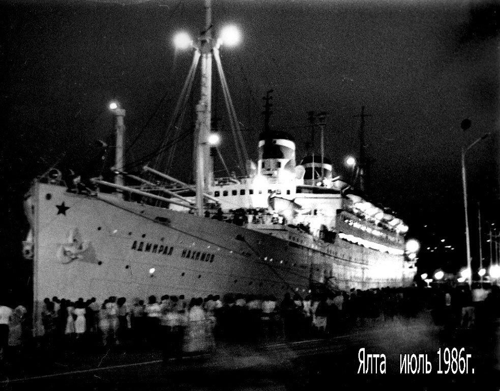 В июле 1986 года мы с женой отдыхали в Ялте "дикарями". Как то вечером на набережной я сфотографировал лайнер " Адмирал Нахимов". В конце августа, уже дома, услышали страшную весть о гибели корабля... Я бросился проявлять пленки и нашел вот этот снимок