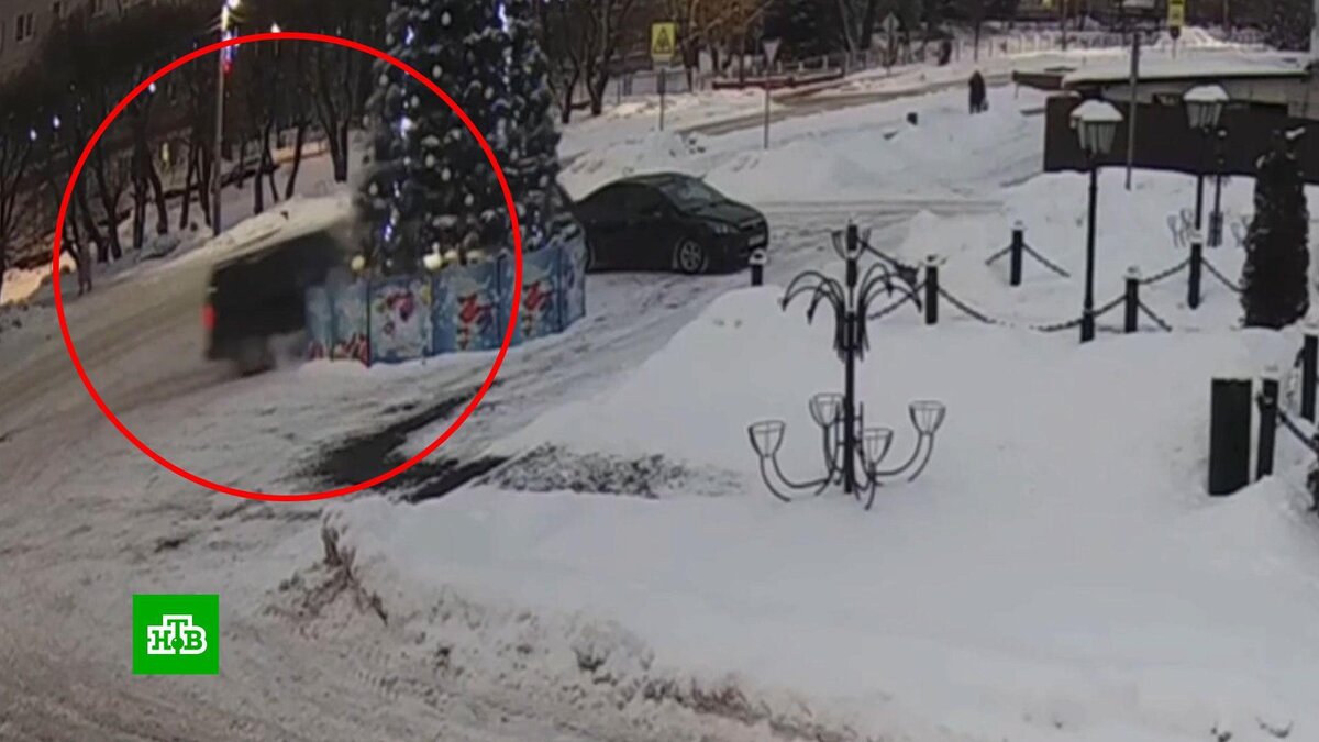 Камера запечатлела, как к машина входит в поворот и, не снижая скорости, сбивает праздничную ель и декоративный каркас. Рядом был припаркован автомобиль, который лихач чудом не задел. После наезда нарушитель сдал назад и оперативно скрылся с места. Неизвестно, в каком состоянии был водитель, в любом случае за ДТП и порчу символа Нового года ему придется ответить.