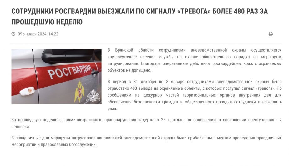Сотрудники брянского управления Росгвардии, которых не коснулась трагедия гимназии № 5 Брянска, где погибли дети, занялись любимым делом. Они опять стали еженедельно составлять и «радовать» население отчетами о выездах. В начале декабря прошлого года, когда произошла трагедия, «Брянские новости» задались вопросом, как Росгвардия отчитается в понедельник после стрельбы в гимназии? «Речь идет о еженедельных докладах, когда силовики сообщают о количестве выездов за неделю: 300, 350 или 500. Эти пустые пресс-релизы ведомство выдает каждый понедельник, чтобы рассказать населению о своей работе. Более сомнительной формы отчетности мало кто придумал. Кстати, почему еще не стали докладывать, сколько метров проехали на выездах?Хватит ли совести выдать такой отчет после кровавой стрельбы в гимназии № 5 Брянска? Сейчас ведомство молчит. Будто все, что произошло, их вообще никак не касается». Брянское управление Росгвардии затихло на месяц. Очевидно, пока шел разбор полетов, как оружие оказалось в