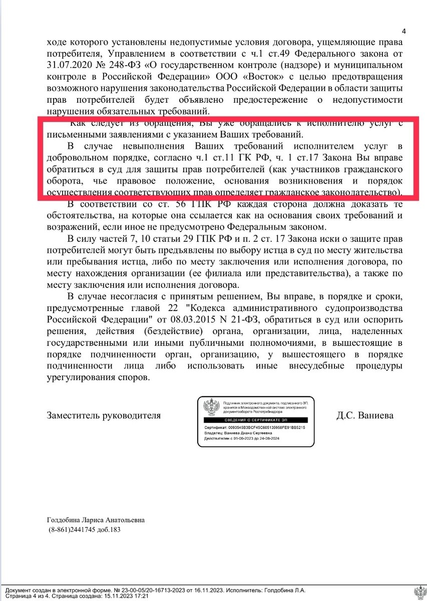 «Претензии, жалобы на несоблюдение условий настоящего Договора предъявляются «Заказчиком» в письменном виде и подлежат обязательной регистрации «Исполнителем». Ответ по существу претензии или жалобы «Заказчика» должен быть дан не позднее 10-ти дней (!) согласно Закону РФ от 07.02.1992 N 2300-1 (ред. от 04.08.2023) "О защите прав потребителей" с момента их получения «Исполнителем».
