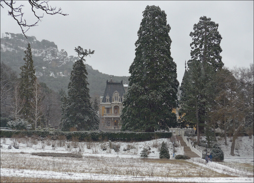 Это стало у нас превращаться в традицию — приезжать в парк Верхней Массандры в снегопад (дневники 2008 и 2009 гг.). Когда мы высадились из такси у подъёма к так называемому дворцу Александра III, снег падал густыми хлопьями — но был отчётливо мокрым. Делалось очевидным, что судьба ему в скором времени превратиться в дождь…