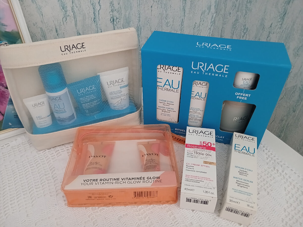 тут кремы для лица, крем для кожи вокруг глаз, средство для умывания, маски увлажняющая и с витамином С, сыворотка и СС-крем URIAGE. Вся косметика - это космецевтика французских фирм URIAGE и PAYOT. Думаю, что на 6-8 мес мне этих запасов должно хватить.