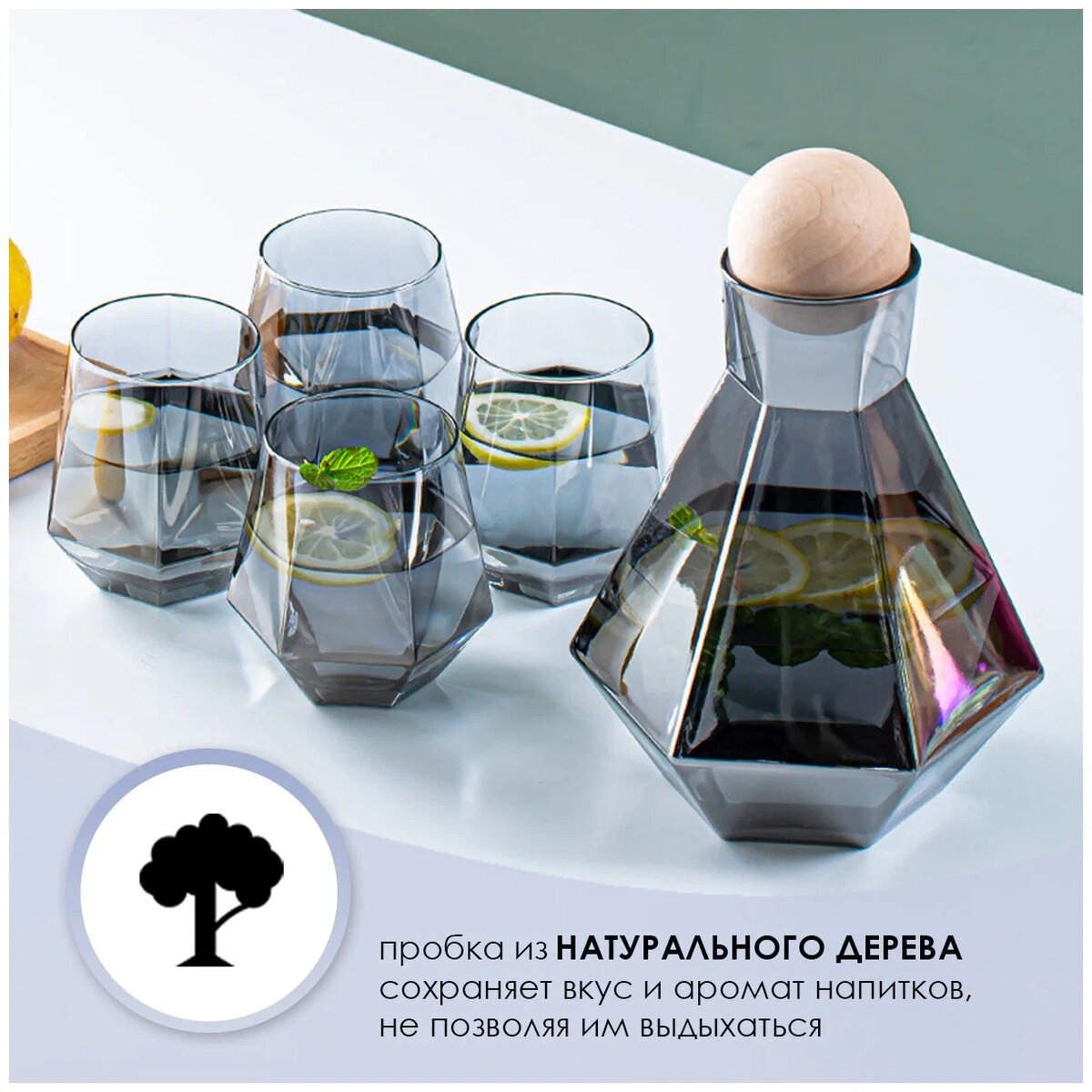 Это набор подарочный для сервировки и подачи напитков состоит из 4 бокалов и 1 графина с деревянной крышкой и предназначен для сервировки праздничного или повседневного стола. Все предметы в наборе выполнены из высококачественного затемненного стекла. Этот лаконичный, но стильный сет из четырёх бокалов и графина станет украшением любого стола. Оттенок стекла делает комплект особенно стильным, придавая более насыщенный оттенок напиткам. Этот набор прекрасно подойдёт как для сока, лимонада, так и для алкогольных напитков. Удобные шестигранные стаканы вместительные и устойчивые, а благодаря скошенным граням стенок - бокал может стоять на столе под углом, не проливая напиток. Графин с узким горлышком имеет красивую, круглую пробку из натурального дерева, которая не позволяет напиткам выдыхаться. Набор станет отличным подарком близким, друзьям или коллегам к любому празднику, на юбилей, новый год или день рождения. Заказать данный товар можно по ссылке: https://ya.cc/m/PTWWbYt
