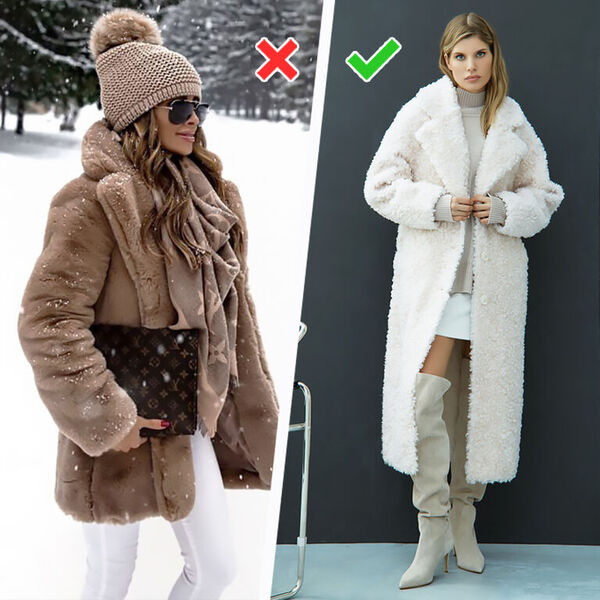 Сдаем на переработку: пушистую шубу из дешевого экомеха. Антитренд легко определить: мех путается, направлен в разные стороны, смотрится неаккуратно. С такой моделью получатся только дешевые образы.