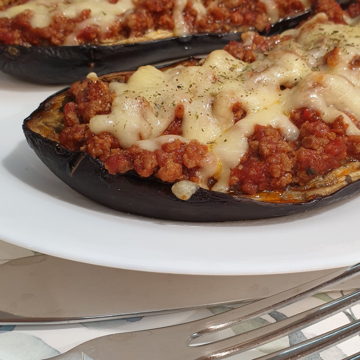Традиционно мясной соус болоньезе готовят с пастой. Но я сегодня макароны заменила баклажанами. Получилось тоже очень вкусно, но немного все-таки легче, нежели с пастой. Очень рекомендую попробовать, такое блюдо вполне можно подать как основное на праздничный стол, не избито, сытно и красиво. Понадобится Баклажаны 4 шт Фарш 500 гр Лук 1 шт Чеснок 1 зубчик Томаты резаные в собственном соку 400 гр Томатная паста 2 ст.л Сыр 150 гр Подсолнечное масло Соль, перец, сушеный базилик Приготовление Баклажаны разрезать вдоль пополам. Сделать насечки не на всю глубину, чтобы не повредить кожицу, посолить и оставить на 30 минут. Через полчаса промакнуть бумажным полотенцем выделившийся на баклажанах сок. Переложить баклажаны на противень и отправить в горячую духовку. Запекать при 180 градусах 35 минут. В сковороде в небольшом количестве подсолнечного масла обжарить фарш. У меня фарш домашний свинина и говядина, прокрутила вместе с луком и чесноком. Если у вас фарш покупной, то сначала