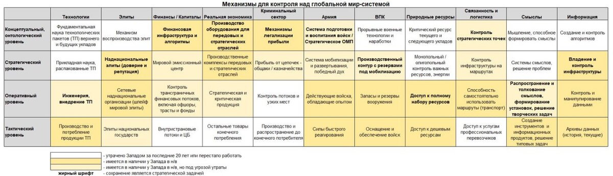 В рамках глобальной мир-системы Pax Americana в 90-е годы у США / Кластера транснациональных корпораций был практически полный контроль на всех уровнях: концептуальном, стратегическом, оперативном и тактическом. За последующие 20-25 лет много было упущено и процессы продолжаются. Особенно болезненна утрата концептуального и стратегического уровня. В 2020-2021 гг. были предприняты титанические попытки перегрузить систему, загнав мир в инклюзивный капитализм, вернуть этим концептуальный уровень, не вышло.