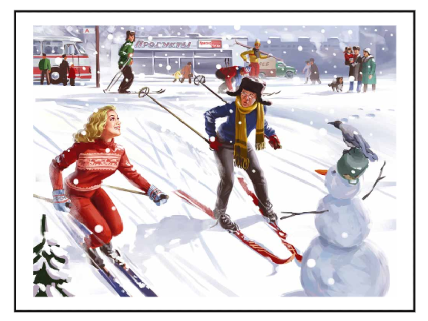 На первой картинке мы можем наблюдать процесс катания с горки на лыжах. Тут я проворчу аж по поводу двух деталей. Первая - вывеска "Продукты" на заднем фоне. Художник отсылается к советским годам, но вывеска явно осовремененная. Вторая придирка к снеговику - ну кто нормальный будет его лепить на склоне горки? Неудобно же.