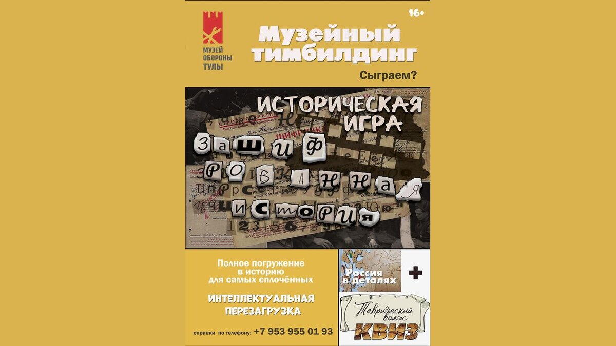 Историческую игру «Зашифрованная история» в Музее обороны Тулы придумали специально для коллективов участников в возрасте старше 16 лет. Так, игра «Зашифрованная история» в Музее обороны Тулы – это полное погружение в летопись героических дней осени 1941-го года. Участники пройдут по улицам сражающейся Тулы и увидят многочисленные раритеты военного времени. Они примерят роли защитников города и выполнят целый ряд заданий. Главное, что требуется от каждого – это внимание и наблюдательность. После экскурсии ждет увлекательная командная игра. Подсказки и ответы на многие вопросы имеются в музее. По информации Тульского музейного объединения.