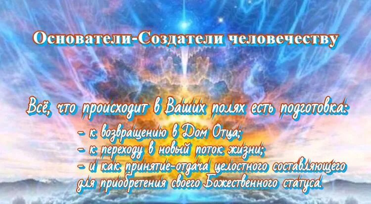Были варианты, чтобы изменить Ваш мир пройденным опытом через известные Вам Лемурию, Гиперборею, Атлантиду, но ответим открытым текстом: Человек, не осознавший всех своих ошибочных взглядов, не сможет жить в новых условиях в своём новом мире, ибо принятие опыта есть продвижение на ступень выше, где Душа раскрывает свои многолепестковые звенья и уже в новых отсеках вибрационного коридора ей будет более комфортно выполнять свои обязательства. Поэтому перевоплощение будет через осознание. Каждая Душа будет проходить свой вибрационный настроечный момент. Это нелегко для человеческой сути. Будут отмечаться и разочарования, и недовольство, и даже физическая боль. Но без этих перестроечных композиций, что имеет за собой полную переструктуризацию клеток головного мозга и взращивание нитей ДНК, человеческой сути нет входа в новую реальность. Те сути, что пребывают в состоянии продолжительного заторможенного сна или, другими словами, имеют некую деградацию, они беспричинно будут покидать физический план и направляться в другой пространственный коридор жизни и это крайне большой процент. Как ни печально для Вашего восприятия, но данные процессы будут задействованы в рамках сохранения жизни Души.