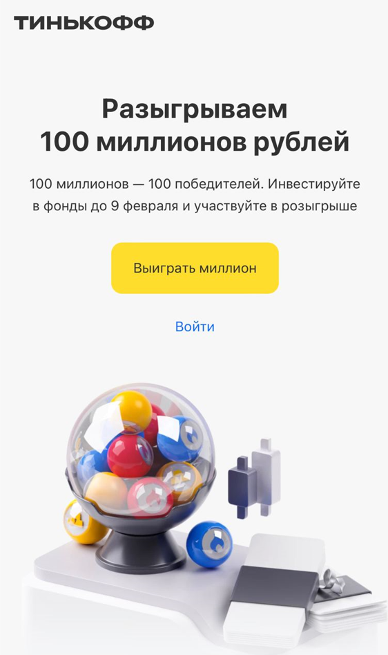 Если начнете сегодня инвестировать с Тинькофф Инвестициями, то есть классный шанс принять участие в розыгрыше 100 млн. рублей!