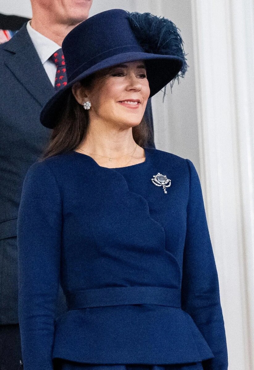 Снежным утром в понедельник 15 января в Копенгагене датская королевская семья собралась на очередное празднование начала правления короля Фредерика X на прием в парламенте Дании. И мы подробно рассмотрим украшения дам. Король и королева Дании прибывают на прием в Фолькетинг, парламент Дании, во дворец Кристиансборг: На приеме также присутствовал их сын, наследный принц Кристиан. К ним присоединились еще три члена семьи: мать короля, королева Маргрете; его брат, принц Иоахим, и его тетя, принцесса Бенедикта. Прием состоялся в первый полный день правления нового короля. Этот день памятен и по другим причинам. Это 52-я годовщина провозглашения его матери, которая правила как королева Маргрете II, с 1972 года. И это также день рождения одной из самых значительных прародительниц семьи, Маргарет Коннаутская. Она родилась 142 года назад, 15 января 1882 года. Королева Мэри прибыла на прием в Фолькетинг в прекрасном темно-синем костюме с туфлями, перчатками и шляпой в тон: Она украсила компл