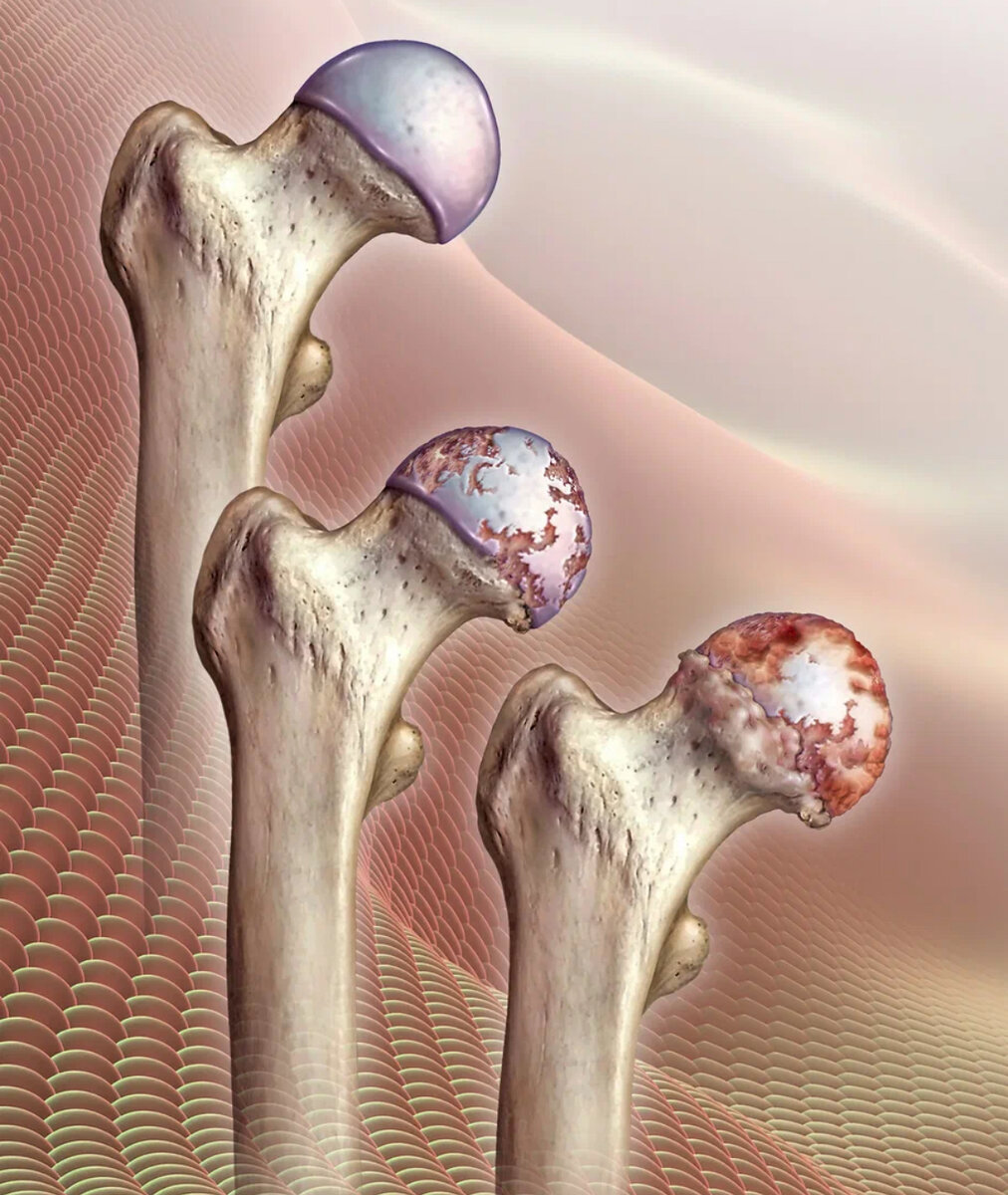 Таз наклонен кпереди, он давит на головку в верхне-задней части, перегружается хрящ. Он источается, затем стирается. Кость начинает тереться о кость, полируется до зеркального блеска: