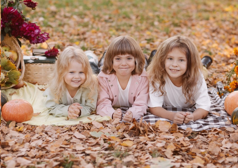 На фотографии изображены три счастливых ребенка, лежащие на пикниковом одеяле среди осеннего листопада. Их яркие улыбки и веселые глаза отражают беззаботное детское счастье. Разноцветные осенние листья создают живописный фон, а элементы осеннего урожая, такие как тыквы и корзина с сезонными плодами, добавляют атмосферности этому уютному осеннему сценарию. Ясное небо и теплый свет, возможно, указывают на приятный теплый день, идеально подходящий для наслаждения на свежем воздухе.