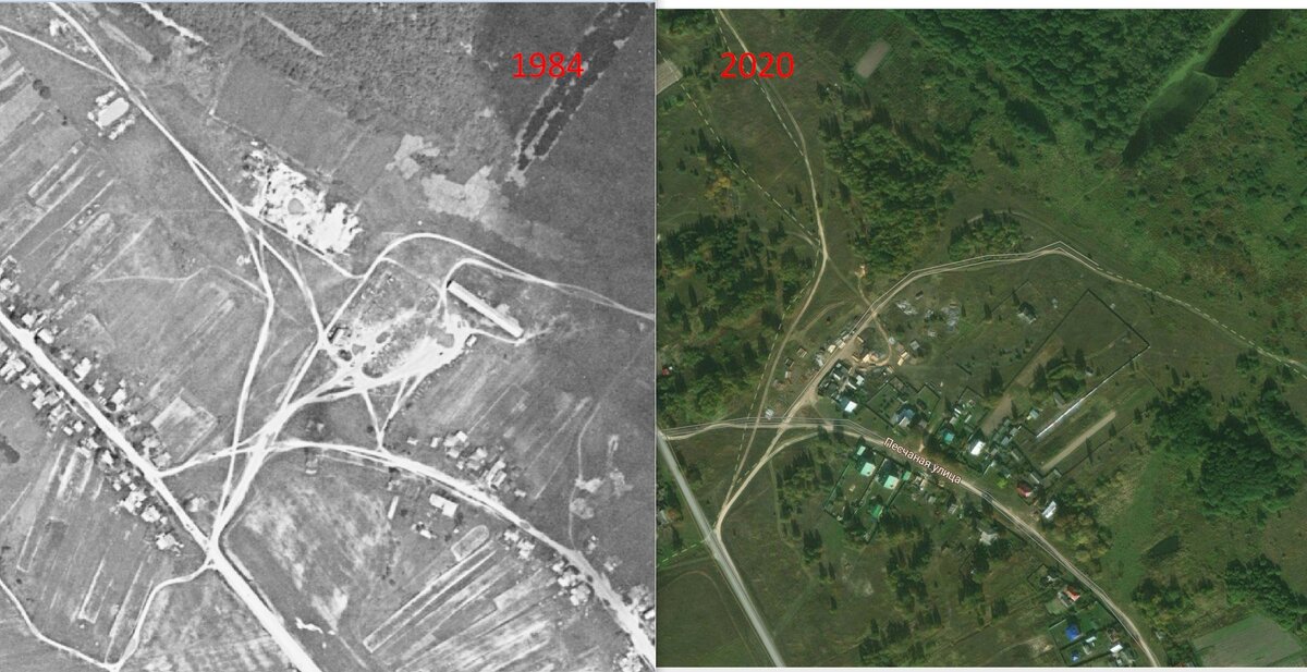 На первом скрине вы можете увидеть склейку спутниковых снимков местности в 1984 году и сейчас. На снимке от 1984 года хорошо видны телятник и стоянка сельхозтехники. На современном снимке видны только огороды и пустырь заваленный обрезками горбыля от местной пилорамы.