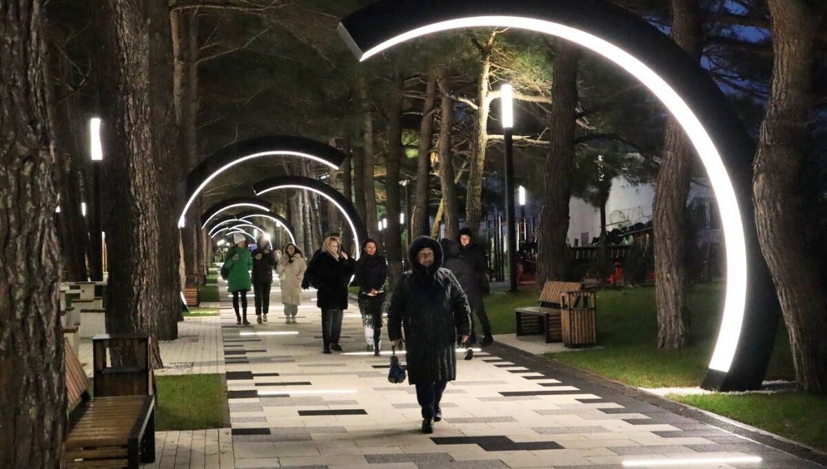 В популярном курортном себе Кабардинка в нескольких километрах от Геленджика завершили строительство современного благоустроенного сквера. На 5000 квадратных метрах зелёной зоны возле моря появились лавочки, качели, необычные светильники, тренажёры, светомузыкальный фонтан. Проектировщики и строители сохранили все сосны, растущие на месте сквера, кроме того, там были высажены и новые редкие растения: альбиция ленкоранская, крымская сосна, кусты караганы древовидной, кипарис.