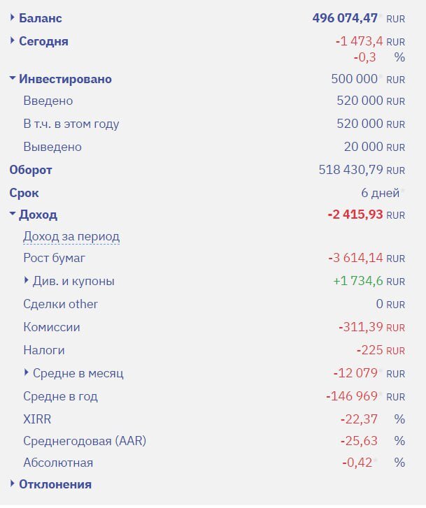 Обращаем внимание наших читателей, что у нас в структуре портфеля появился ETF (это инвестиции в фонд ликвидности LQDT). С учетом того, что нами были приобретены фьючерсы на рынок Гонгконга и рынок США (на 100 т.р. и 50 т.р.), то по ним были сформированы гарантийные обеспечения в общей сумме 30 т.р. Мы сохранили на этом счете ликвидность, перекрывающую гарантийное обеспечение в 3 раза, а свободный остаток средств разместили в фонде ликвидности под ставку 15% годовых.