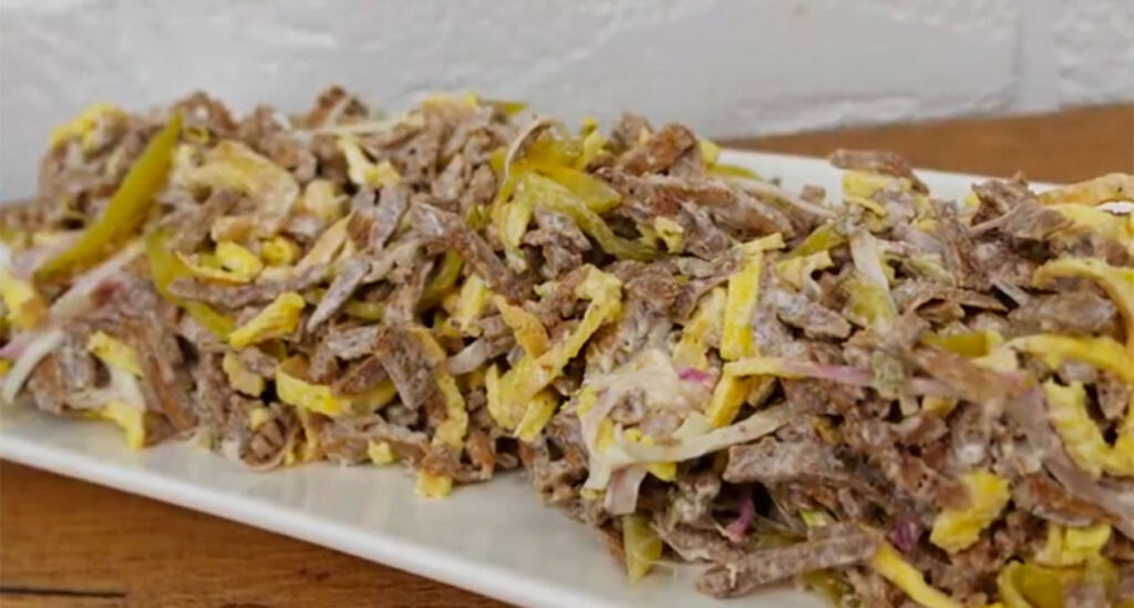🔸Огурец соленый 3-4 шт Как приготовить салат из яичных и печеночных блинчиков Небольшую луковицу нарезаем тонкой соломкой и маринуем с помощью 5 гр сахара, 2 гр соли, 10 гр бальзамического уксуса и небольшого количества воды. Перемешиваем и оставляем — пусть маринуется. Тем временем займемся блинчиками. Для печеночных блинчиков Возьмем 400 гр куриной печени, 1 небольшую луковицу, 1 яйцо и 50 мл молока. Взбиваем все ингредиенты с помощью блендера в однородную массу. Можно в