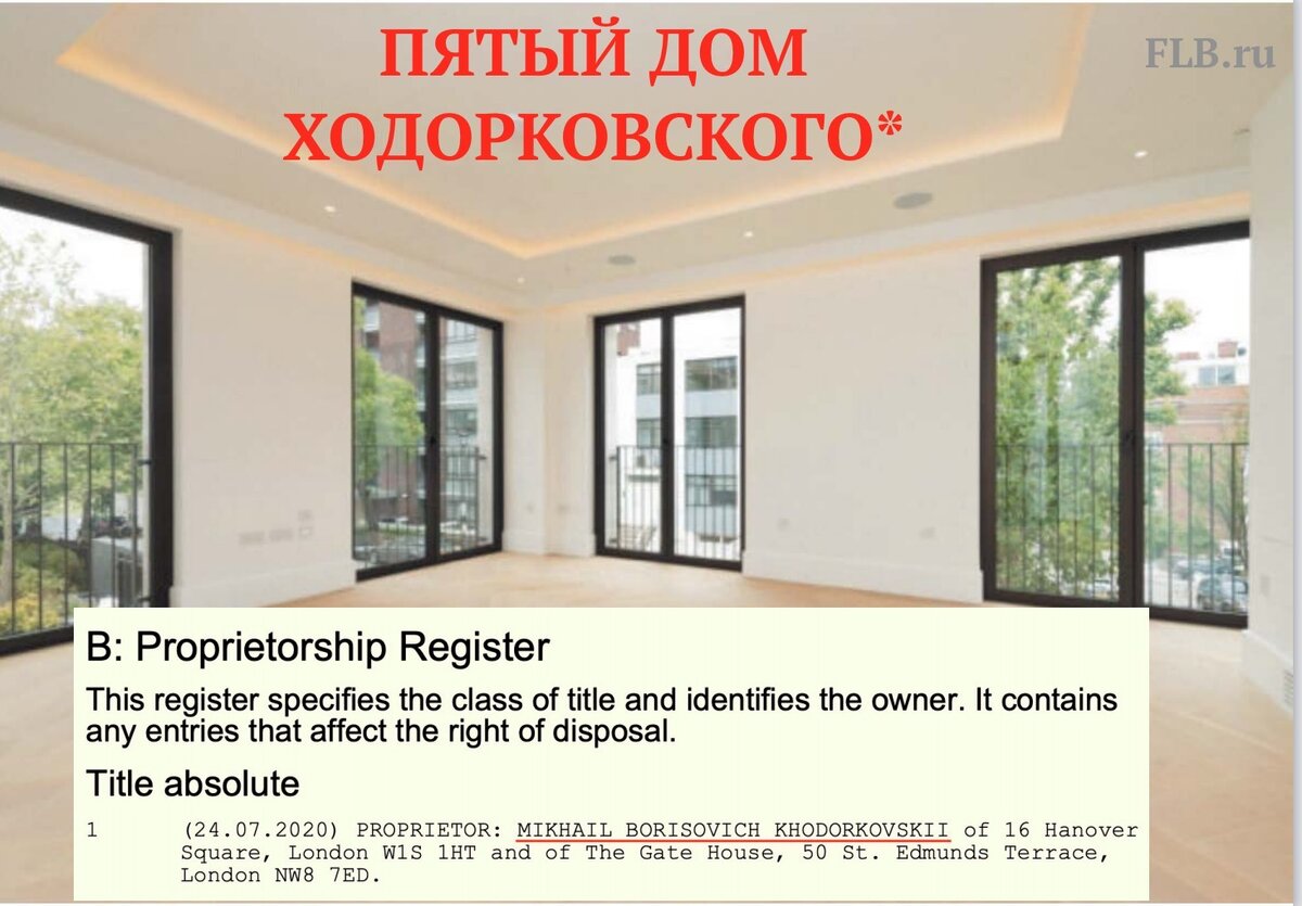 Prigovor.ru выяснил, что 24 июля 2020 года Ходорковский приобрёл на своё имя дом в центре Лондона, в элитном комплексе St. Edmund’s Terrace стоимостью почти 2 млн. фунтов стерлингов. Доселе об этом «гнёздышке» Ходорковского ходили только слухи, но нам удалось установить адрес, цену квартиры и получить выписку из реестра недвижимости. Ходорковского подвела любовь к комфорту: захотелось переделать внутренний дворик, и в запросе муниципальным властям его агент-англичанин честно засветил фамилию заказчика. Так что теперь можно уверенно сказать, что в собственности беглого должника Ходорковского находятся пять элитных объектов недвижимости общей стоимостью £ 24 млн. (почти 3 млрд рублей).