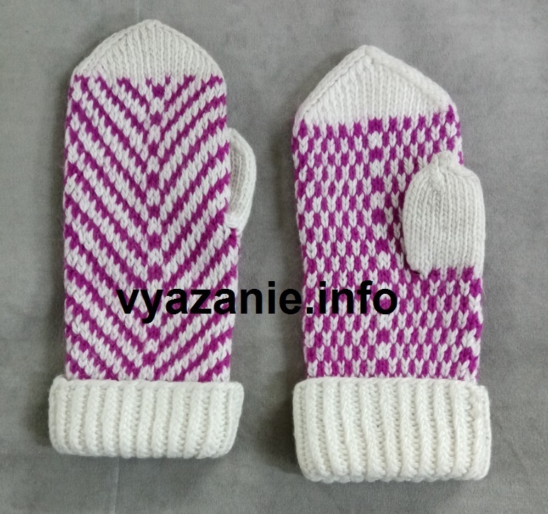 Эти двухцветные варежки вязать очень просто. Хоть детские, хоть взрослые. Тёплые, красивые, яркие и такие уютные! Когда их надеваешь, с любовью вспоминаешь человека, который связал эту красоту. Вяжите варежки для своих любимых и близких людей! Раппорт этого узора всего 4 ряда. Очень легко запомнить последовательность вязания и подглядывать в схему узора не нужно. Так как с внутренней стороны будут протяжки, варежки получатся очень тёплые. Обращаю ваше внимание на то, что вязать нужно с одинаковым натяжением нитей. Если нити стягивать, то варежки будут узкие. Носить их будет не комфортно. Лучше вязать слабо. От того, как сильно натягиваете нить, сильно зависит размер получившейся варежки. У меня связаны женские варежки на 48 петлях и детские на 32 петлях. Так как узоры внутренней и внешней половинок варежек будут отличаться, рекомендую вязать гибкими спицами. На каждой спице свою сторону. Начинаем с резинки *1 лицевая, 1 изнаночная* основным цветом. Для сравнения покажу рядом детские