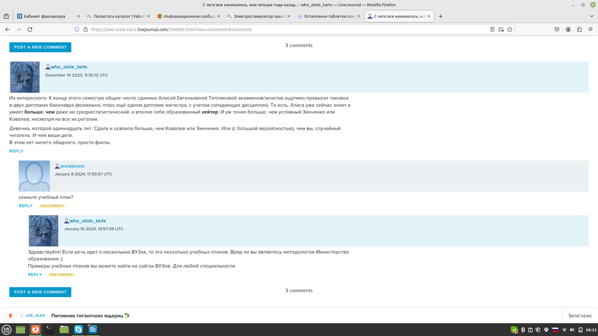 Тем не менее, на его ЖЖ есть оживление в комментариях. Новатора попросили скинуть учебный план гениальных деток. Чего он, конечно же, не сделал, отмазавшись. Наверное, просто потому что нет никакого учебного плана? 8 января Анна пишет: скиньте учебный план? Новатор ей на это отвечает: Здравствуйте! Если речь идет о нескольких ВУЗах, то это несколько учебных планов. Вряд ли вы являетесь методологом Министерства образования ;)