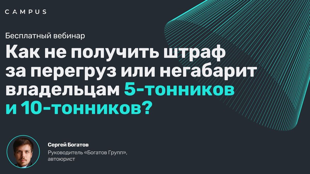Вебинар: «Как не получить штраф за перегруз или негабарит владельцам 5-тонников и 10-тонников?» Когда: 24 января, 17:00 Спикер: Сергей Богатов, руководитель юридической компании в сфере автомобильных грузоперевозок «Богатов Групп» Обсудим на вебинаре: - Штраф за перегруз и негабарит. Когда выписывают? - Что надо сделать владельцам 5-тонников и 10-тонников, чтобы не получить штраф? - Спасают ли закрытые номера от штрафов? - А что со штрафами было в 2023 году? К чему готовиться 5-, 10 и 20-тонникам в 2024 году? Зарегистрируйтесь сейчас и узнайте, как ускорить и оптимизировать процессы в сфере курьерской доставки! ➡️ https://my.mts-link.ru/79656173/105676276