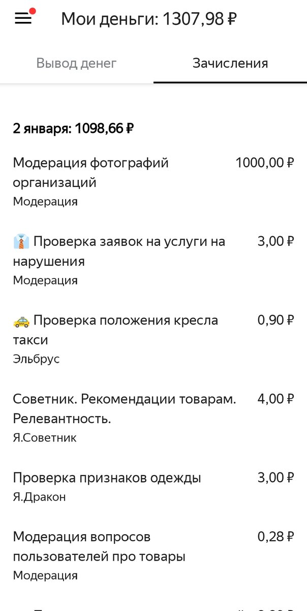 Появилась у меня полезная привычка. Каждый день я захожу в Я.задания. Не скажу, что там у меня много заданий и они высокооплачиваемые, но начало января приятно удивило, вместо привычных 80-100 рублей удалось заработать 1098 рублей. Заработала я на обучении к заданию "Модерация фотографий организаций". Более того, муж работает как самозанятый и его привлекала по реферальной системе в Толоку ещё до Нового года. Получила за него 1000, также привлекала кума, за него тоже 1000 была. Писала уже об этом но напоминаю. Если есть самозанятые, то давайте свою ссылку и делайте задания на общую сумму от 100 рублей с профиля приглашенного. Но сейчас не только об этом. Мужа также зарегистрировала в Я.заданиях. С его профиля тоже появилось "денежное" задание на модерацию фотографий. И вот результат: Вот он мой рекорд. За день, почти как на моей работе. Поэтому если видите такое задание бросайте все и приступайте ☺️. Стоит оно 10 рублей. Почти постоянно я откладываю свои заработки или покупаю то, ч