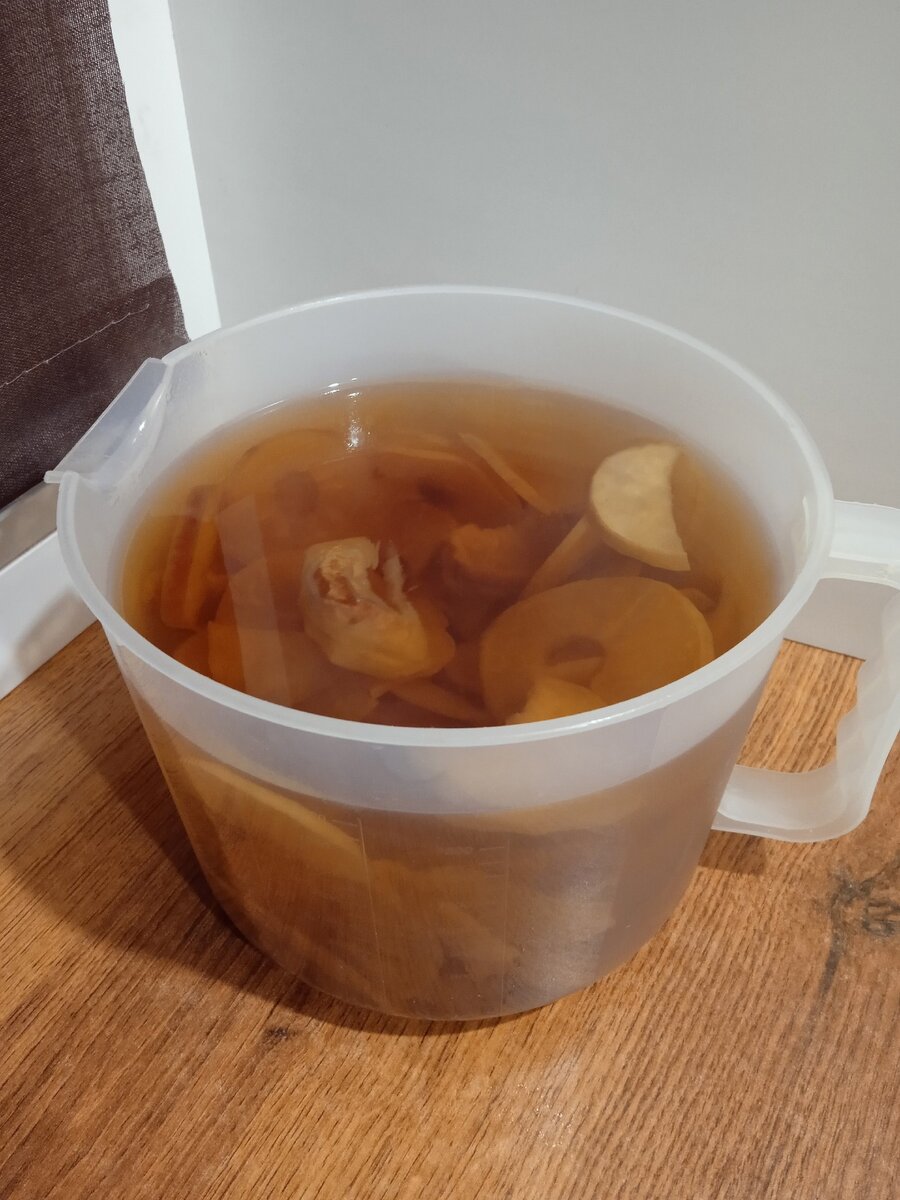 Ребята всем привет. Мы наконец вышли с больничного, Андрейку с утра увела в садик с горем пополам, и бегом домой. Пока шла домой, думала о том, что приготовить на ближайшие два дня. Проверила крупы, бакалею, а так же холодильник и морозилку. Ну и на этом этапе поняла, что у меня ещё остались достаточно не плохие запасы, поэтому решила, что готовить буду исключительно из того, что есть дома. Обращаю Ваше внимание, что молочные продукты, хлеб и скоропорт мы покупаем всегда по факту. Поэтому при походе в магазин в ближайшие два дня, кроме этого я покупать ничего не планирую, посмотрим получится у меня или нет))) Первым делом я сварю Андрейке компот. Почему-то именно в зимний период он его очень хорошо пьёт, поэтому каждый сезон обязательно сушу яблоки и другие фрукты. Ну и учитывая тот факт, что сейчас детки часто болеют, мне кажется компотик из натуральных фруктов для него будет очень полезным. В небольшую кастрюльку наливаю фильтрованную воду, довожу до кипения. Добавляю сахарный пе