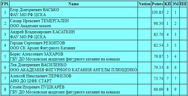 Как и ожидалось за счет тройного лутца, сначала сольно, а затем и в каскаде 3+3, элементы выиграл Егор Васько. У Самира Темергалина с каскадом 3+3 пока не все так хорошо, а потому в зачет пошел гораздо более дешевый каскад 2+3 аксель-тулуп. Егор и Самир ушли уже далеко вперед и их 1-2 место не вызывает никаких сомнений, а уж кто станет первым, а кто вторым покажет только произвольная программа. Естественно, что за счет бОльшего числа тройных прыжков фаворит все же Егор Васько.