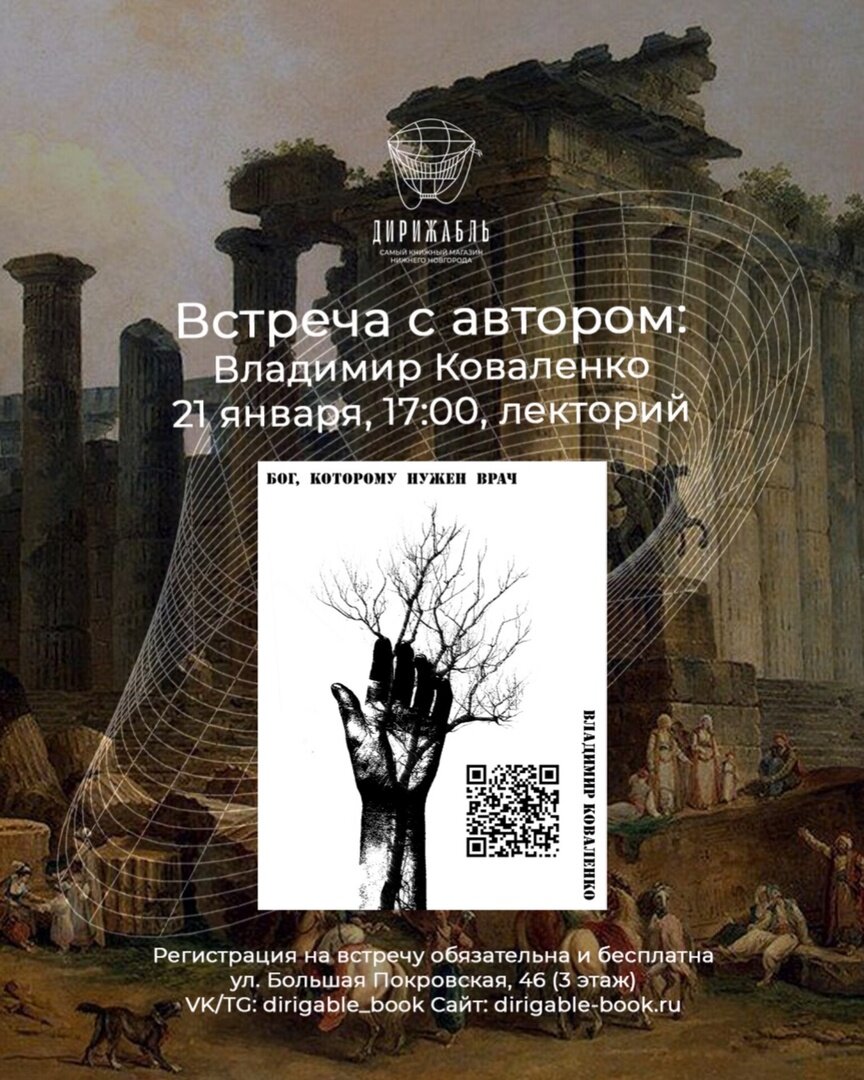 Встреча с литератором состоится 21 января. Петербургский писатель Владимир Коваленко презентует в Нижнем Новгороде свою книгу «Бог, которому нужен врач» (18+), встреча с литератором состоится 21 января в книжном магазине «Дирижабль» на Большой Покровской улице. Начало мероприятия в 17:00. «Роман написан в духе мистического реализма и скроен по сложному лекалу постмодернистской прозы современного образца, — говорится в сообщении. — Петербург, наши дни, коммунальная квартира, на стене — год падения Рима. Концепция романа повторяет принцип духовного восхождения в системе христианского мистика Иоанна Лествичника». Также во время встречи автор книг «Ах куй», «ТОК ТОК» и «Ничто» расскажет, как создать сложный постмодернистский роман и увлечь им читателя. Зарегистрироваться на бесплатную встречу можно здесь. Возрастное ограничение: 18+