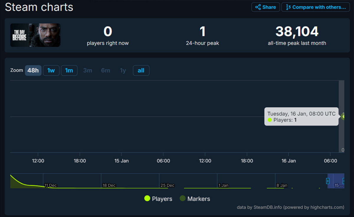 The Day Before – один из главных провалов прошлого года, если не самый главный. Заимствование чужих идей, отсутствие собственных, обещания «с 3 короба», драматическое техническое состояние привели к закономерному результату. Всё так плохо, что спустя 6 дней после релиза студия вообще закрылась, покупателям вернули деньги и отобрали игру, а 22 января серверы перестанут работать. Несмотря на то, что у игроков The Day Before отобрали принудительно (ну как «принудительно», все очень рады), кто-то до сих пор умудряется в неё играть. SteamDB обнаружил одного-единственного пользователя. Прямо сегодня был онлайн. Вероятно, это тот самый парень, которому ключ игры вручила Opera.