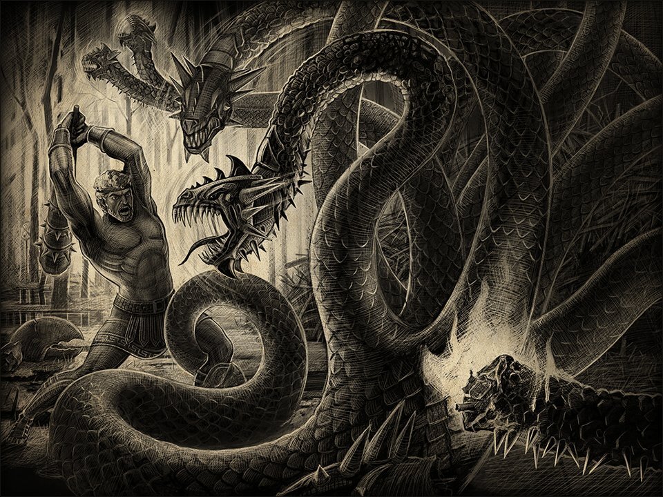У города Лерны, прямо в болоте Многоглавая гидра когда-то жила. Ела бездельников и тех, кто в работе В общем была воплощением зла. Вот эту сестрицу Немейского льва Герою и надо было убить. Дело сложнейшее, не так что раз-два, Так что подмогу пришлось попросить. Ему помочь Иолай согласился. Племянник его не раз выручал. Запряг колесницу, вооружился. И к дяде стрелой он поскакал. Чтоб по болоту не вместе ходить, Иолая решил близ рощи оставить. В теории просто – найти и убить. Всего девять раз её обезглавить. *** Жила она в пещере у болота, Где больше никого не обитало, Ведь даже её лёгкая зевота В округе всех бесщадно убивала. Не зря ведь на змею она похожа. И головы драконов пышут ядом. Блестящая её на солнце кожа… Несла погибель всем, кто с нею рядом. И чтобы сразу тут не умирать И не уйти безвременно в Аид, Решив дыхание надолго задержать, В пещеру стал стрелять Герой-Алкид. А стрелы он пред этим раскалил. Прям докрасна он их в огне держал. И по одной
