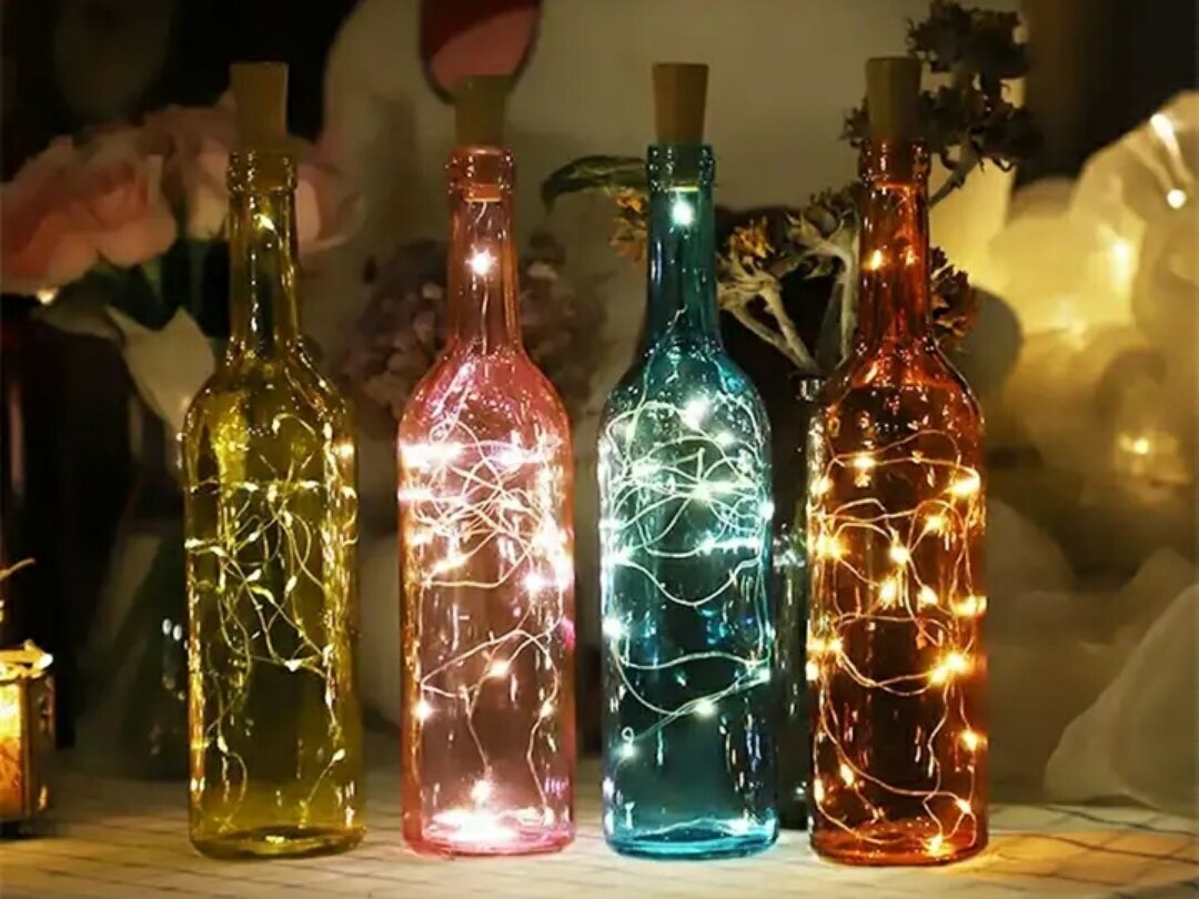 Наверняка вы видели бутылки с гирляндой внутри. При помощи таких нехитрых и доступных конструкций украшают не только помещение на Новый год, но и веранду или летний сад. Украшение считается доступным, нужно всего лишь купить светодиодную гирлянду и украшение для дома готово, а стеклянную тары в виде бутылок, банок и графинов можно и бесплатно раздобыть. Гирлянды продаются в различных магазинах. В Фикс-прайсе популярны среди мастериц гирлянды с пробками (других не завезли), по 99 рублей.Заряжаются гирлянды от солнечного света. А еще есть гирлянды на батарейках они более предпочтительны для использования зимой, когда солнечного света мало. Гирлянды продают как с пробкой для бутылок, так и для других целей. Сейчас купить гирлянду не проблема-спасибо интернету и магазинам, что заводят китайские товары. Использование гирлянды Диапазон использования крошечных гирлянд велик, чаще всего их используют мастерицы в своих подделках. Новогодние украшения Мне подарили новогодний фонарь в виде чайног