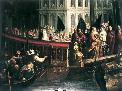 Самым роковым образом прошел и традиционный обряд «Обручения Венеции с морем». Нет, поначалу все шло преотлично. В залив вышла барка, задрапированная малиновым бархатом, в которой сидело высшее духовенство города. Святые отцы читали молитву, благословляя морские волны. За кораблем духовенства в благословенные воды в сопровождении лодок со знатными венецианцами устремился величественный «Буцентавр». На его палубе на алом троне гордо восседал Марино Фальер в горностаевой мантии. На голове его блистала корона дожа, украшенная 70 редчайшими алмазами, рубинами и изумрудами, не говоря уже об отборном жемчуге. Когда галера дожа вышла к острову Лидо, Фальер торжественно поднялся с трона и крикнул: «Мы обручаемся с тобой в знак истинной и вечной власти!» И новый дож бросил в морские волны золотой перстень.