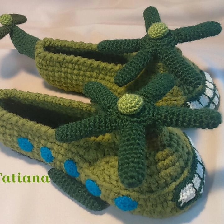 Много лет ко дню влюбленных и 23 февраля вязала тапочки танки. Сейчас они даже наиболее актуальны, чем лет 5 назад))). Но самым интересным заказом стал заказ тапочек вертолетов. Девушка хотела подарить тапки другу летчику. Я долго очень думала как их связать и вот результат. Лопасти крутятся. Мужчина был сражён наповал))). А вот и танки... Их было много. Разных размеров и оттенков. Самые большие танки были 46 размера. Огромнейшие. Но это так мило.