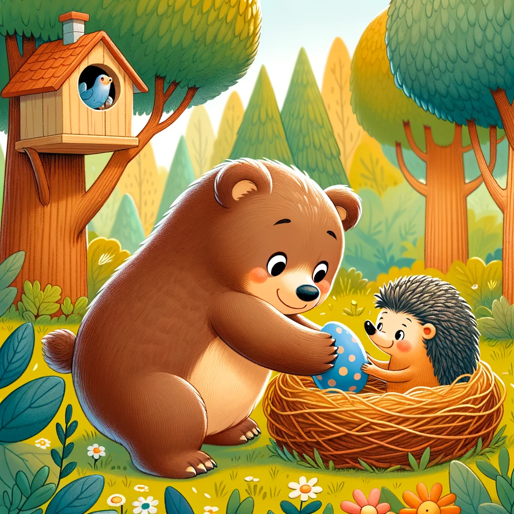 Мишка аккуратно поднял яйцо и положил его обратно в гнездо, а Шушик принес сухие листья и траву, чтобы сделать гнездо теплее. Они тихо ждали, пока не вернулась птичка. Когда она прилетела и увидела, что её яйцо в безопасности, она была очень счастлива.