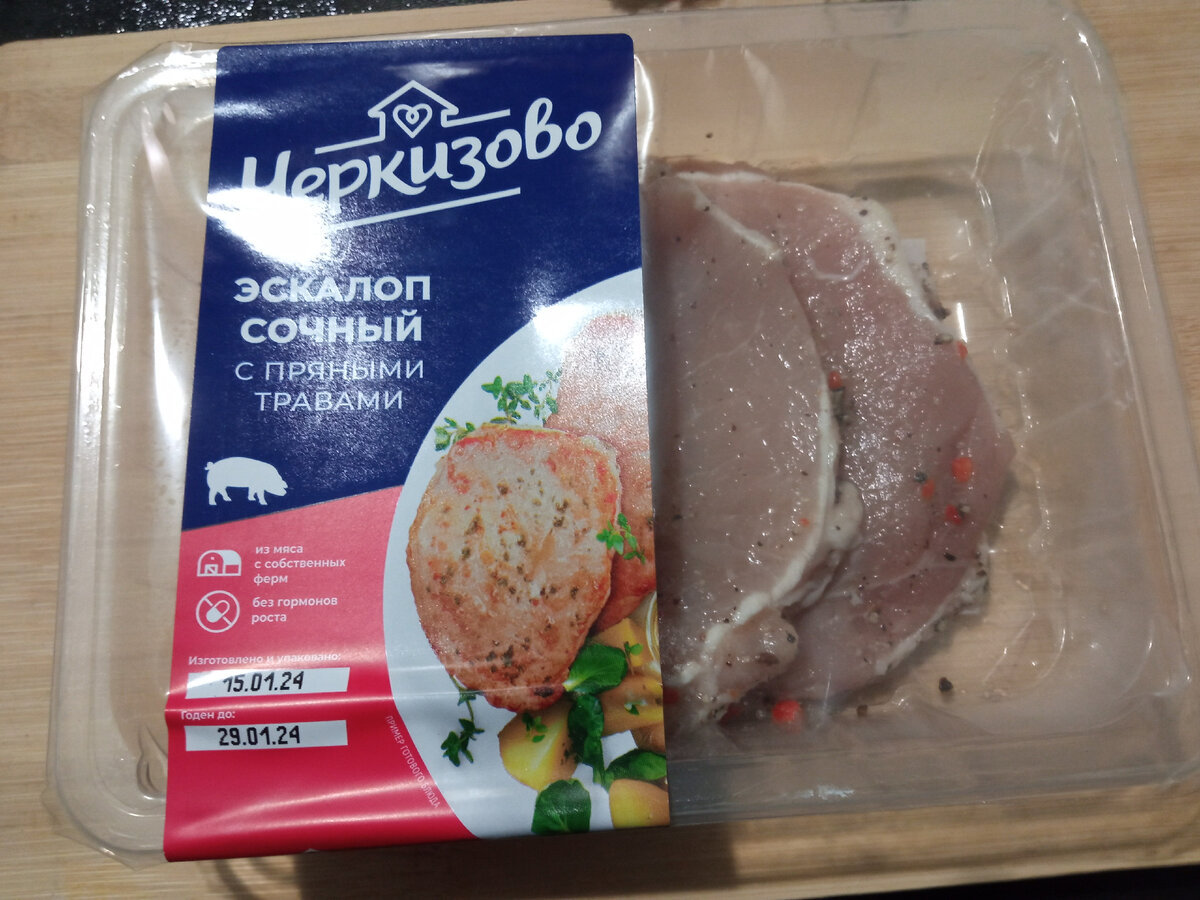 Мясо в Пятёрке покупал разное, в основном неплохого качества и даже очень вкусное попадалось. Например: На днях попалось на глаза мясо от черкизовского мясокомбината, а именно, эскалопы с пряными травами. Как бы без гормонов роста, с собственных ферм и т.д. Хотя в составе присутствуют консерванты, стабилизаторы и загустители, в маринаде видимо. Ну ладно, бум пробовать. Внутри три тонких эскалопа, по полсантиметра толщиной. Вес всего мяса – 300 граммов, стоимость – 199.99 рубликов. Запах не приторный, а как раз пряный, будем жарить… В сковородку две ложки масла, разогреваем пару минут и кладём кусочки мяса. Мясо тонкое, жарим по 3 минуты с одной стороны. Переворачиваем и столько же с другой. В процессе жарки выделяется какая-то белая хрень. Думается, что как раз гормоны роста, которых нет, если верить надписи на упаковке. Или ещё какая дрянь. При жарке другого мяса из той же Пятёрочки, я такого не наблюдал. Ну да ладно, не выкидывать же… В принципе, 6-8 минут для жарки достаточно. Выкла