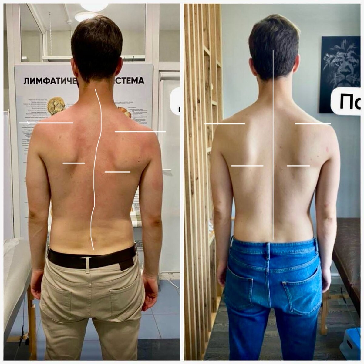 Жалобы: - боли в правой руке, в правом плече, - слабость правой половины тела, - долгая работа в положении сидя. До: - сколиоз, - правое плечо ниже и уходит вперёд, - правая лопатка ниже После: - ровный позвоночник, - одинаковый уровень лопаток, - радикальное улучшение уровня плеч, - плечи расправлены - устранены жалобы по усталости и боли в руке и правой половине тела С чем работали: - диафрагма (дыхание), - желчный пузырь, - желудок. Минимум работы с мышцами рук и плеч - в основном с органами. Органы здесь - первопричина проблем!
