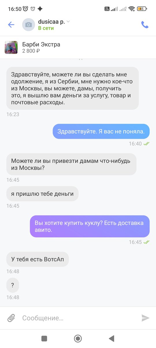 Здравствуйте! Не поздороваешься - плохо. Сразу закидывают тухлыми помидорами. Ну да суть не в этом. Я выложила ненужные вещи на продажу на известном сайте Юла. Странное совпадение, но при опубликовании каждой записи создавалась группа в ВК из 3х человек (я третья), где меня просили срочно написать тёте, дяде, маме, дабы они купили мой товар не на сайте, конечно. Я нигде, кроме Юлы не выкладывала товар. И к этой ерунде уже привыкла. Но! Сегодня стало ещё интереснее! Мне пишет "человек из Сербии" (пол не знаю) на русском языке и просит, умоляет купить куклу в Москве и выслать её в Сербию! Пишет хорошо, с окончаниями. Просит писать по-английски. Но я, увы, не знаю этот язык. Затем мошенник кидает мне ссылку якобы на эту куклу на Юле. Но переходя по ссылке происходит что-то странное. Не зная типа русского языка, покупатель очень хочет куклу именно на русском! Какой то странный покупатель. Русский прекрасный, окончания хорошие, но с китайским акцентом. Тыкает! Давит. Вот мне инт