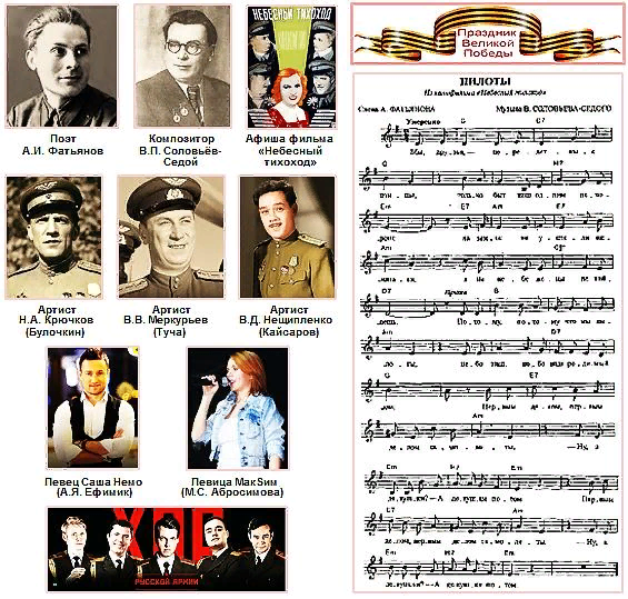 …В мае 1940 года Фатьянов призван в армию, в сентябре назначен режиссёром-постановщиком Окружного Ансамбля Орловского Военного Округа. В это время опубликовал свои первые стихи и очерки. Начало войны застало ансамбль в авиагарнизоне Сеща под Брянском. В первые месяцы Фатьянов с концертами объезжал позиции Брянского фронта и писал рапорта с требованием отправить его в действующую армию, но руководство ансамбля отказывало. В феврале 1942 года ансамбль был отведён в тыловой город Чкалов. Там Фатьянов познакомился с композитором Соловьёвым-Седым, в творческом союзе с которым создано много популярных песен. В июне 1944 года откомандирован в состав Краснознамённого ансамбля песни и пляски СССР на должность заведующего литературно-драматургической частью. С сентября 1944 года – фронтовой корреспондент армейской газеты «На разгром врага». В декабре 1944 года при штурме города Секешфехервара (Венгрия) был ранен. В апреле 1945 года откомандирован в Таллин в распоряжение ансамбля моряков Балтики. Выступал в инсценировках, читал стихи, занимался режиссурой. Много читал и сочинял. В мае образовался творческий дуэт Владимира Сорокина и Фатьянова. Они создали несколько произведений, написанных в самых лучших традициях русской песенной культуры. Их записали в Москве на Всесоюзном радио. Соавторы «облегчали» жанр, согласно требованиям тогдашнего искусства: ничего мрачного, только весёлое, светлое, яркое… Тогда же им было предложено написать песни к фильму про лётчиков малой фронтовой авиации. Назывался кинофильм «Небесный тихоход». Снималась эта героическая комедия на Ленфильме. Трое друзей пели голосами актёров песню на стихи Фатьянова «Потому, что мы пилоты». Весёлая, бодрая песенка с интонациями мужского здорового кокетства очень понравилась актёрскому составу. Другого мнения были критики, но народная слава подминает под себя всё, даже авторитетное мнение уважаемых искусствоведов. Вот уже 75 лет эта песня не просто существует – она живёт и поныне вызывает жизнеутверждающую улыбку.