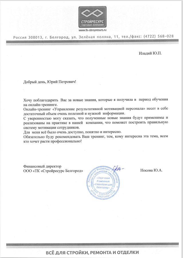 Свой отзыв о тренинге оставила финансовый директор Группы Компании Стройресурс Носова Юлия Александровна: “Хочу поблагодарить Вас за новые знания, которые я получила в период обучения на онлайн-тренинге.