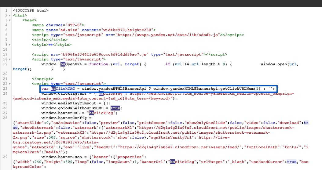 HTML5-баннеры — это инструмент рекламы в Яндекс Директ, направленный на повышение узнаваемости бренда. В отличие от стандартных графических объявлений, баннеры можно сделать анимированными и динамическими. Такие HTML 5 креативы помогают бороться с «баннерной слепотой» пользователей и наращивать охваты ЦА. Для создания креативов мы использовали онлайн-платформу Creatopy. Чтобы добавить баннеры в графическую или медийную кампанию, предварительно нужно оптимизировать код вызовом метода из Яндекс.Справка. Сразу обозначим, что модификация кода — это монотонный процесс. В код каждого баннера (если брать по максимуму — 30 штук) важно вставить код вызова метода Яндекс, иначе баннеры не пройдут модерацию. Массового способа изменения кода на данный момент нет, поэтому необходимо прорабатывать баннеры один за другим. В статье наш вариант модификации кода, с которым получилось пройти двухэтапную модерацию в Яндекс.Директ. Плюс раскрываем один нюанс, о котором умалчивает Яндекс.Справка. Двухэтапная