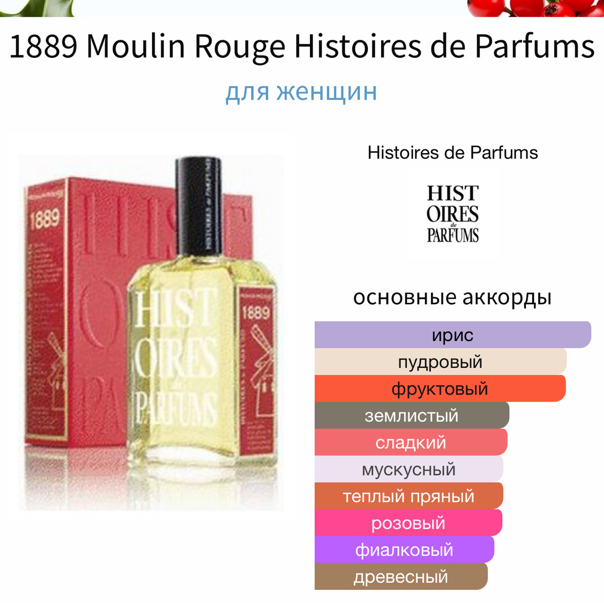 Помадный ирисовый, чуть припыленный аромат с красивыми и душноватыми шоколадными пачулями, или 1889 Moulin Rouge Histoires de Parfums. Я жду уже с начала декабря этот шедевр парфюмерного искусства из-за рубежа. Заказала через Сдек. Ниже характеристики и пирамидку прилагаю.