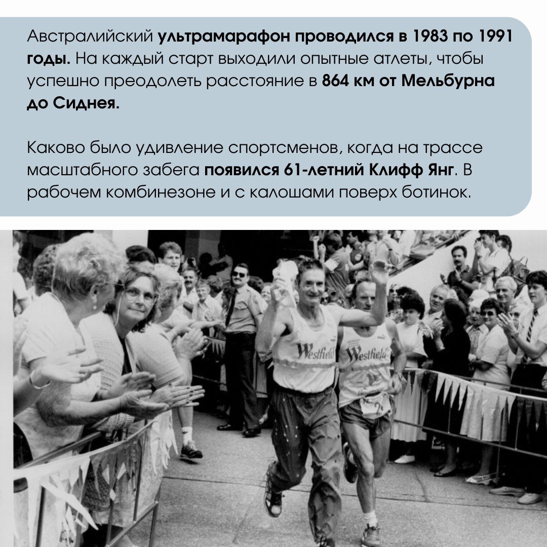 или история одного австралийского бегуна, который-то и бегуном не был, а фермером. И вошел в историю своим забегом, стилем этого забега и поведением на финише, в первую очередь потому что ЕМУ БЫЛ 61 ГОД! Клифф Янг - до сих пор национальный герой Австралии, спустя 40 лет. Тогда его называли «стариком, бегущим марафон». Но похоже, что стариками оказались, как обычно, те, кто не верит в возможности человека.